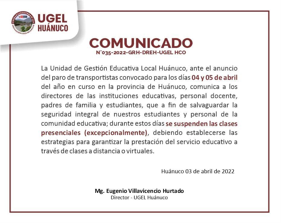 Ugel Huánuco suspende clases ante paro de transportistas