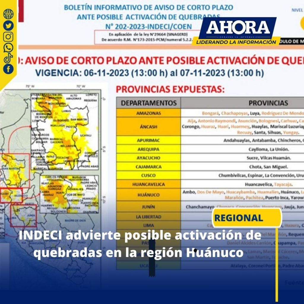 INDECI advierte posible activación de quebradas en la región Huánuco