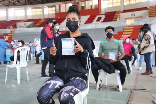 Vacunados cuatro atletas peruanos clasificados para los Juegos Olímpicos Tokio 2020, contra la Covid-19 en el Coliseo Wanka de Huancayo.…