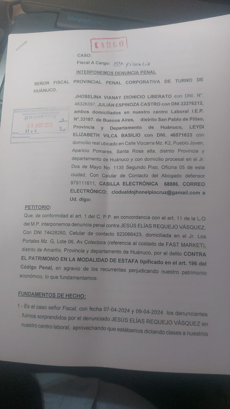 Una denuncia penal presentada ante el Ministerio Público por Jhoselina Vianay Dionicio Liberato, Julián Espinoza Castro y Leydi Elizabeth Vilca…