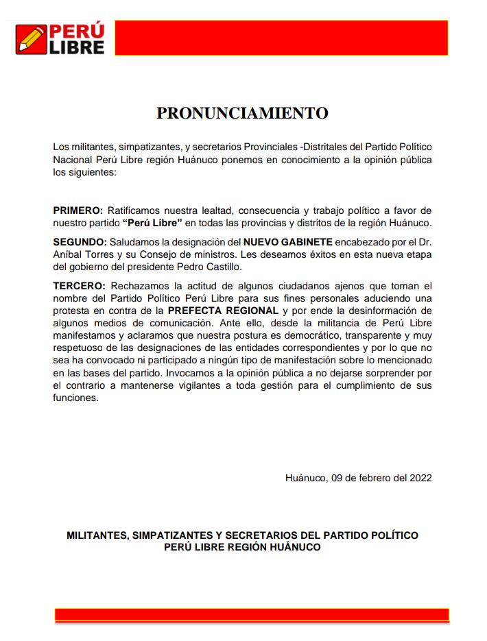 A través de un pronunciamiento, el partido político Perú Libre rechazó la actitud de algunos de sus partidarios, quienes días…
