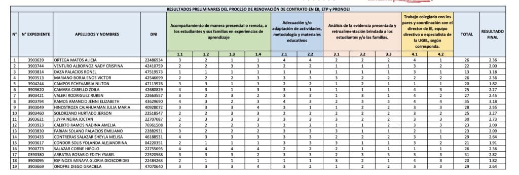 El proceso preliminar de evaluación de desempeño docente para la renovación de contrato en instituciones educativas unidocentes dejó como resultado…