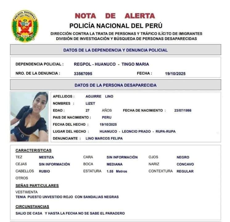 La Policía Nacional del Perú emitió una Nota de Alerta por la desaparición de Lizet Aguirre Lino, una joven madre…