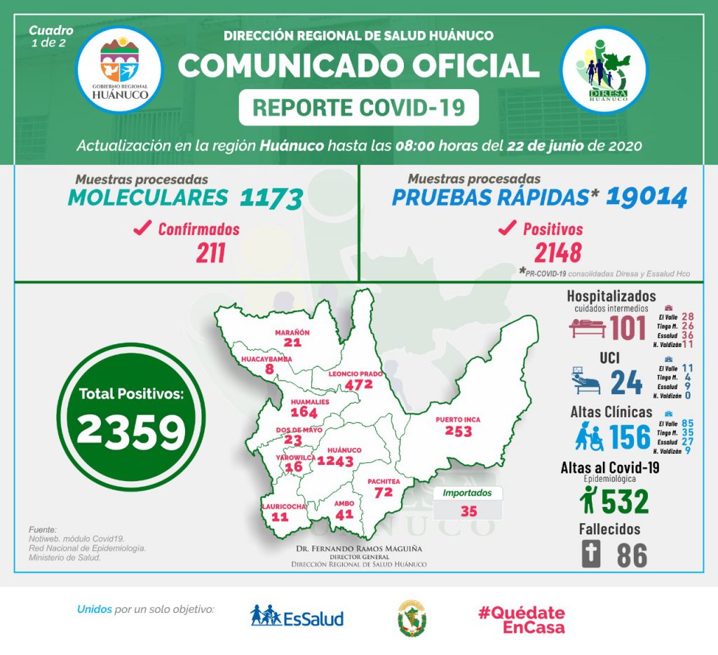 Huánuco, Leoncio Prado y Puerto Inca lideran cifras de COVID-19