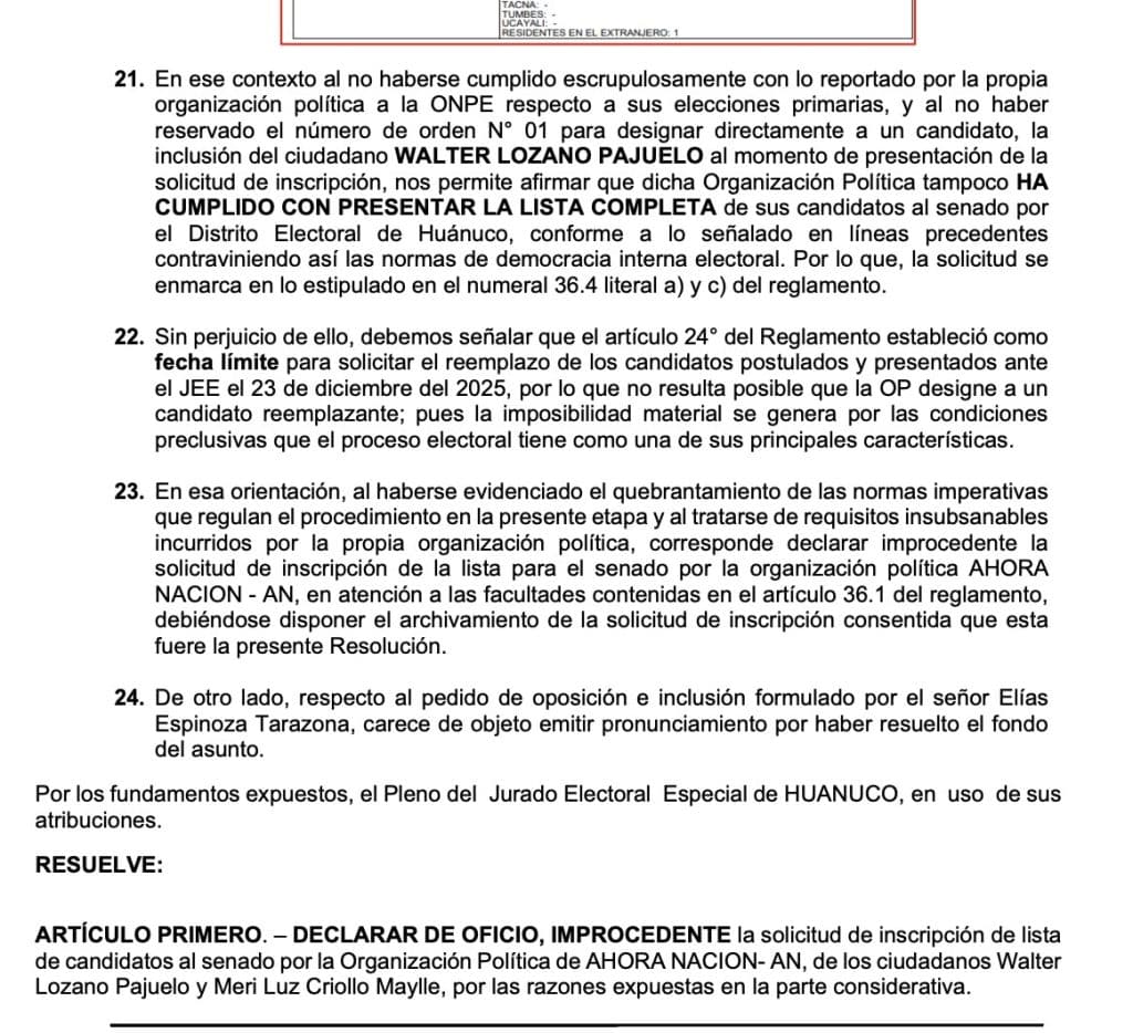 JEE Huánuco rechaza lista al Senado de Ahora Nación por incumplir normas internas