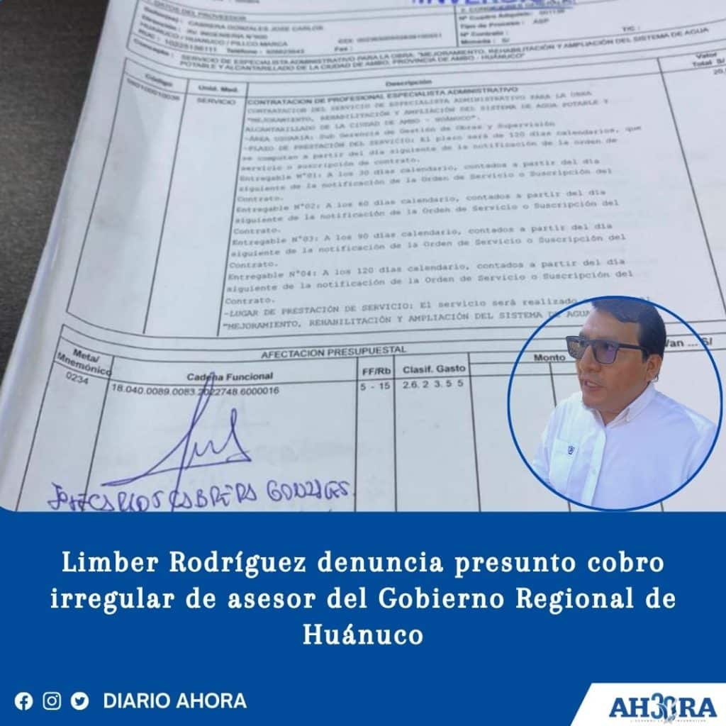 Limber Rodríguez denuncia presunto cobro irregular de asesor del Gobierno Regional de Huánuco