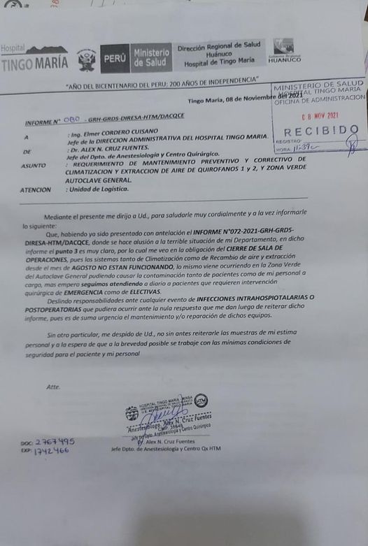 Según el informe N° 072-2021 emitido por el jefe de anestesiología y centro quirúrgico, Alex Cruz Fuentes, la sala de…