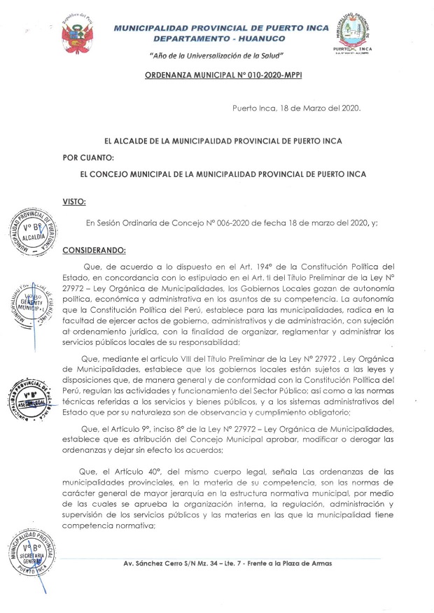 Municipalidad de Puerto Inca emite Ordenanza para ayudar prevenir Coronavirus
