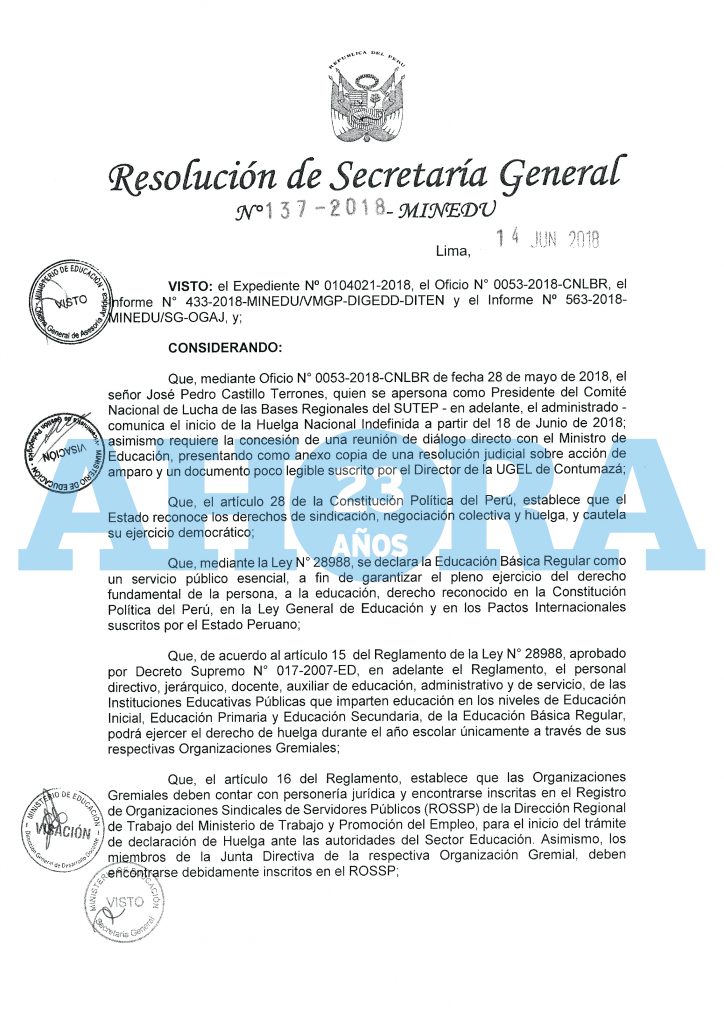 La Secretaría General del Ministerio de Educación emitió el jueves 14 de junio la resolución n.° 137 que declara improcedente…
