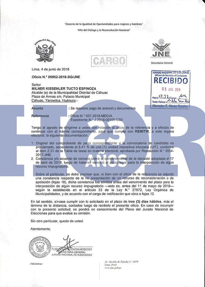 Mediante el oficio n.° 05952-2018-SG/JNE, emitido por el Jurado Nacional de Elecciones (JNE), se ha notificado al alcalde encargado de…