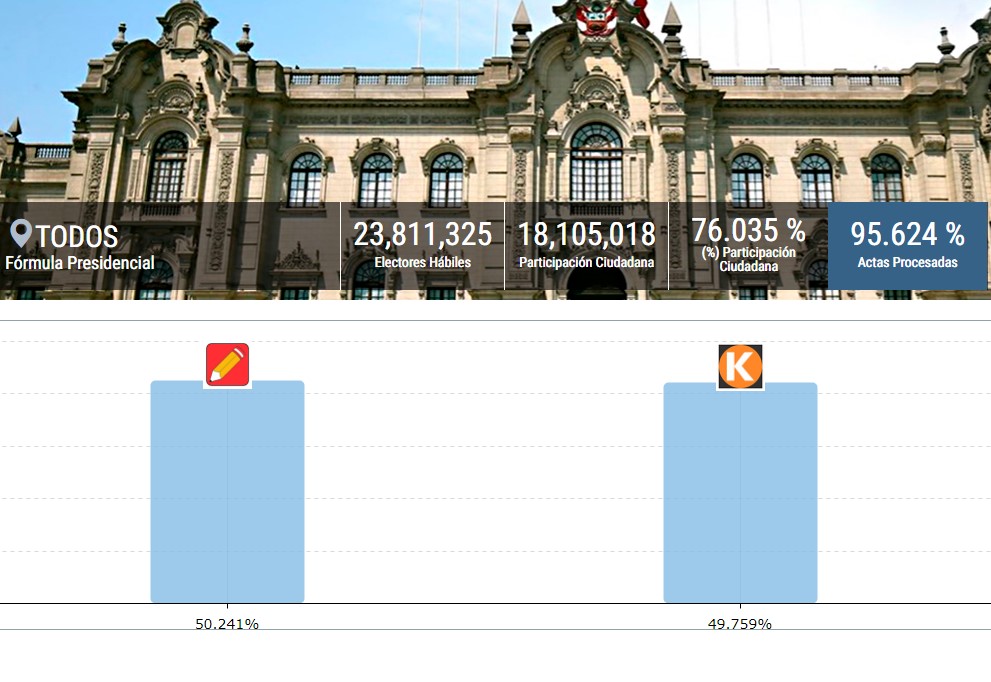 ONPE al 95.624%: Castillo 50.241% y Fujimori 49.759%