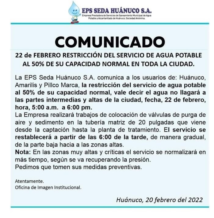 Nuevamente, la empresa prestadora de servicios de agua y desagüe Seda Huánuco S.A., mediante un comunicado anunció la baja de…