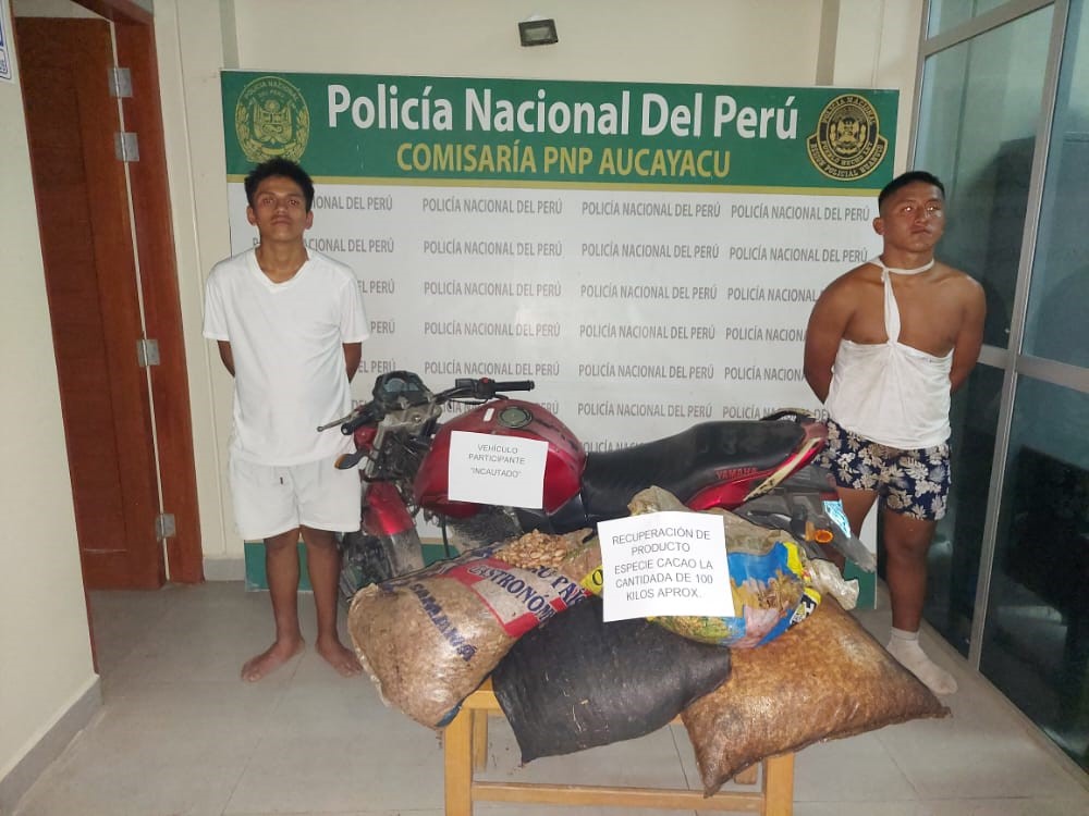 Dos jóvenes, fueron capturados por agentes de la Policía tras ser sindicados de robar 100 kilos de cafés en Aucayacu.