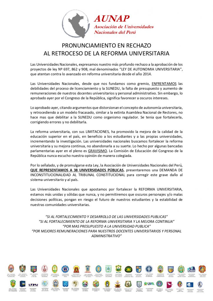 Las 38 universidades nacionales del país expresaron su rechazo a la aprobación de los proyectos de ley Nº 697, 862…