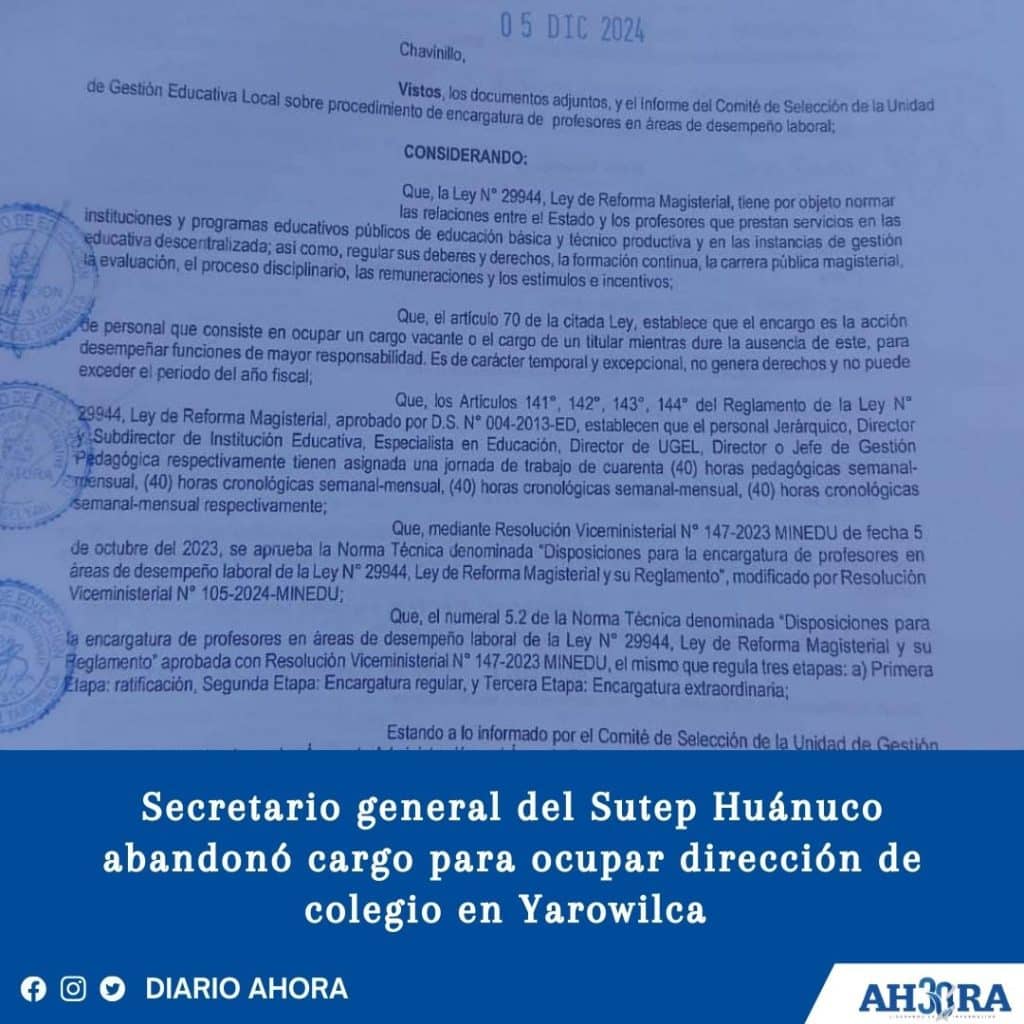 Secretario general del Sutep Huánuco abandonó cargo para ocupar dirección de colegio en Yarowilca