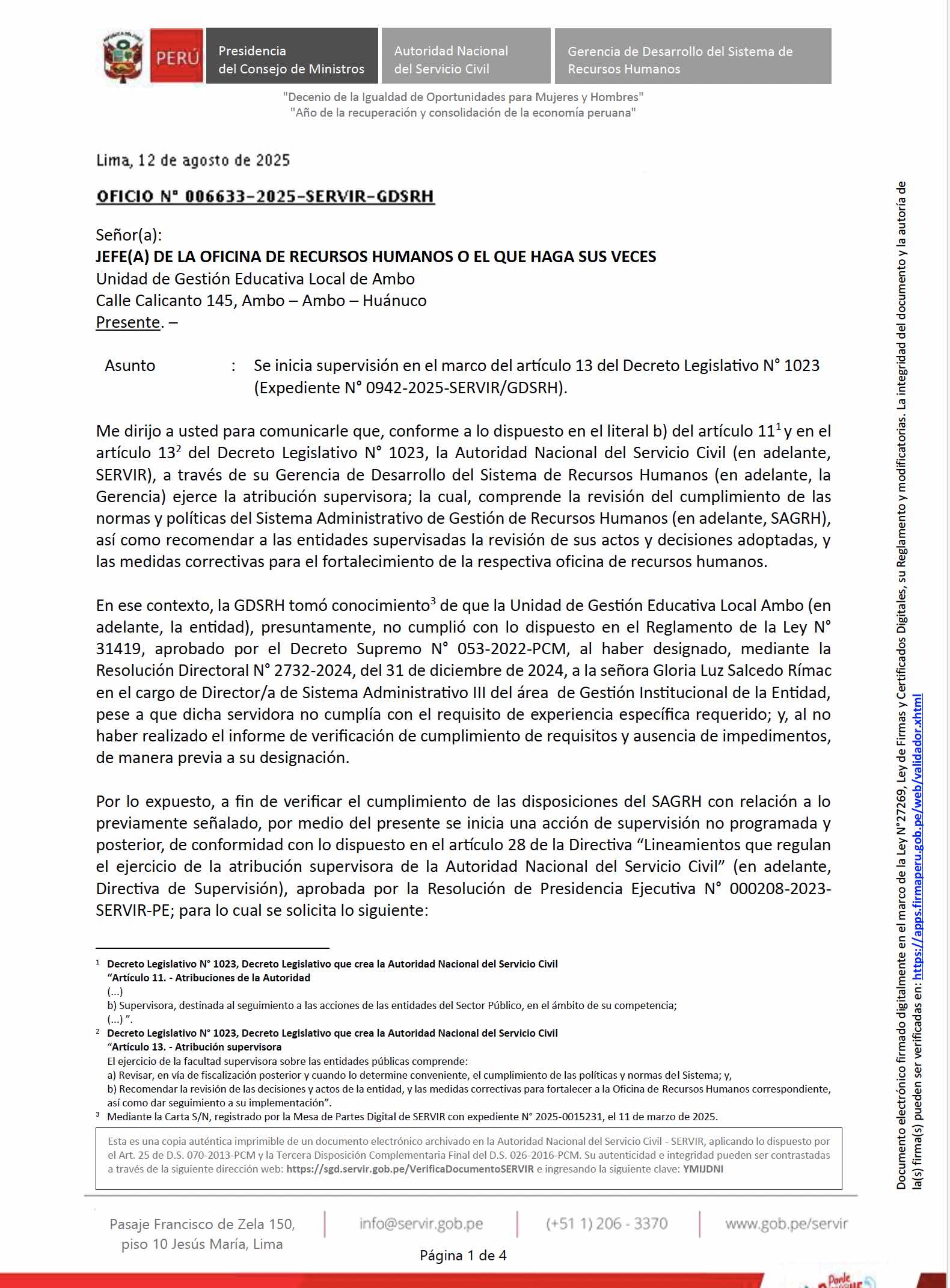 SERVIR inicia supervisión en UGEL Ambo por presunta designación irregular