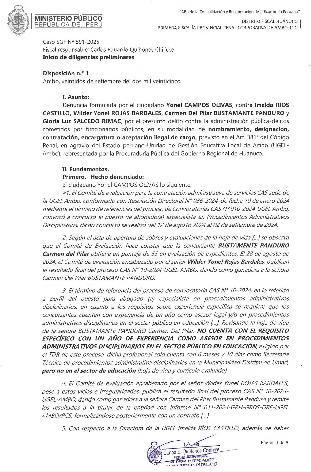 La Fiscalía Provincial Penal Corporativa de Ambo dispuso iniciar diligencias preliminares por presuntas irregularidades en un concurso público y en…