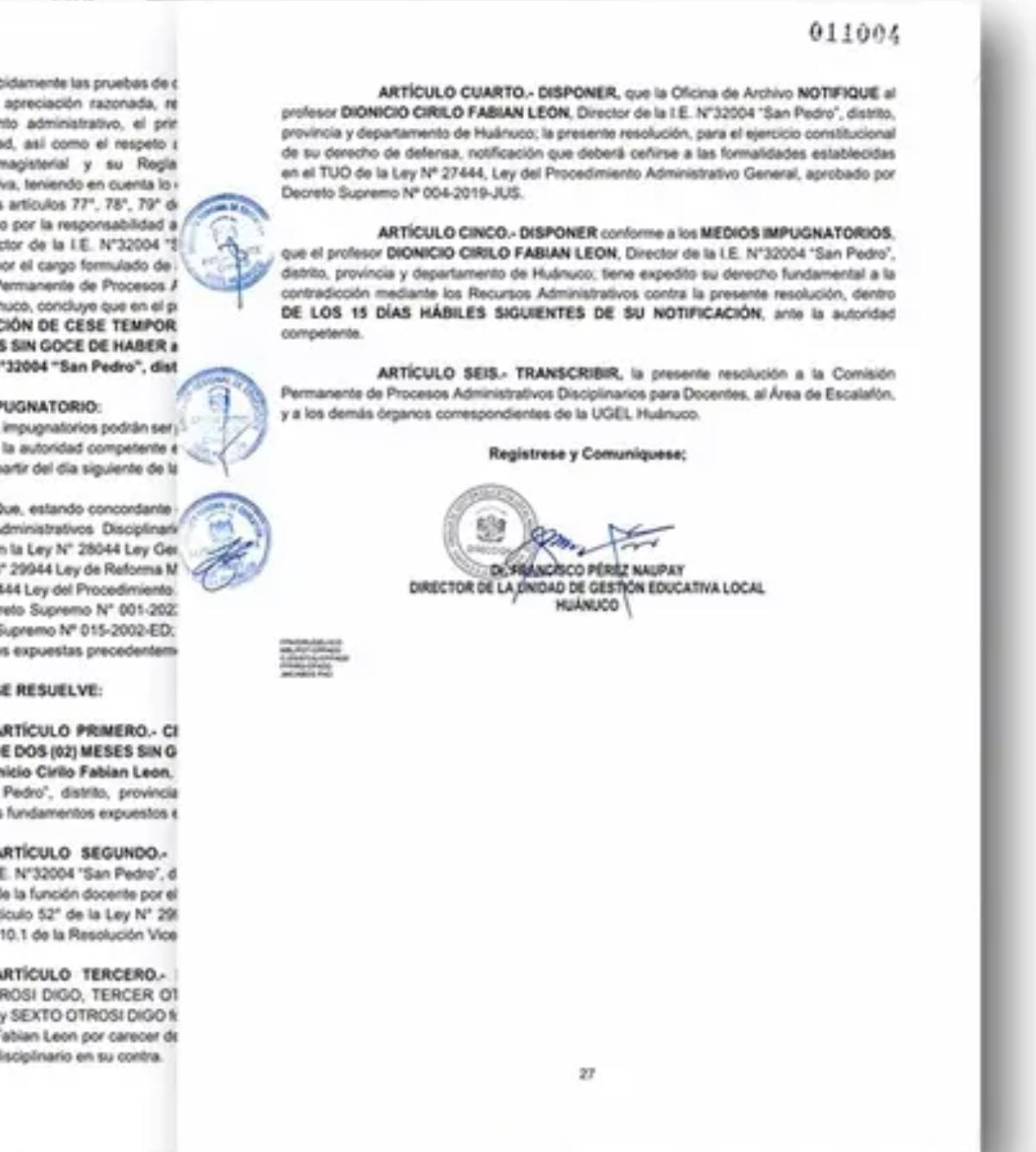 La Unidad de Gestión Educativa Local (UGEL) Huánuco dispuso la suspensión por dos meses, sin goce de haber, del director…