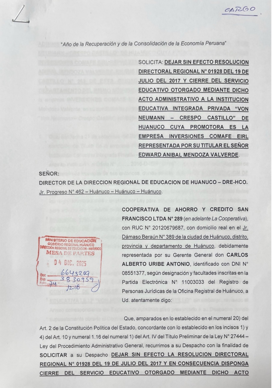 UGEL reconoce denuncia de cooperativa San Francisco por autorización de colegio Von Neumann