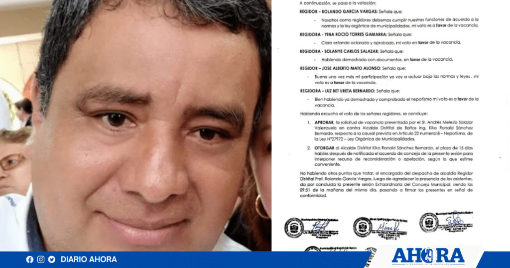 El alcalde del distrito de Baños (Lauricocha), Kiko Sánchez Bernardo, fue vacado ayer por unanimidad del Concejo Municipal.