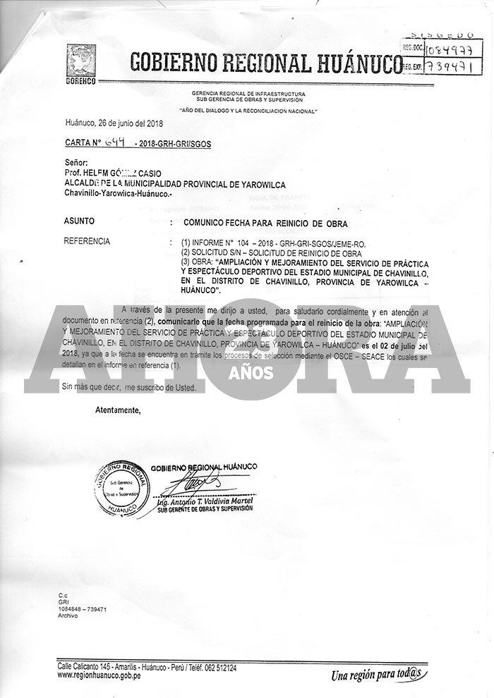 “Actualmente está paralizado hace más de un mes porque se acabaron los materiales, pero hoy el subgerente de Obras, Ing. Antonio Valdivia me entregó un documento comprometiéndose a reiniciar el trabajo el lunes 2 hasta su culminación”, afirmó.