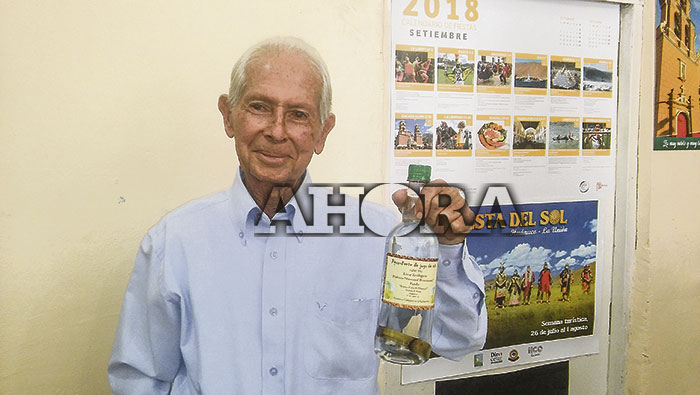 Gustavo Gargurevich con su aguardiente de caña de azucar