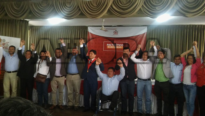 Trece agrupaciones políticas suscribieron ayer el Pacto Ético Electoral organizado por el Jurado Nacional de Elecciones. Por la no agresión y una contienda limpia firmaron 10 candidatos a gobernador regional y otros 3 representantes de las organizaciones.