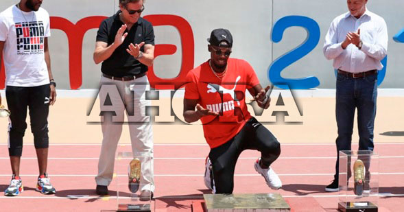 El ‘Hombre más rápido del mundo’ sobre los 100 metros, dejó sus huellas en un bloque de cemento fresco que fue preparado especialmente para la ocasión en el estadio, cuya construcción está próximo a terminarse.