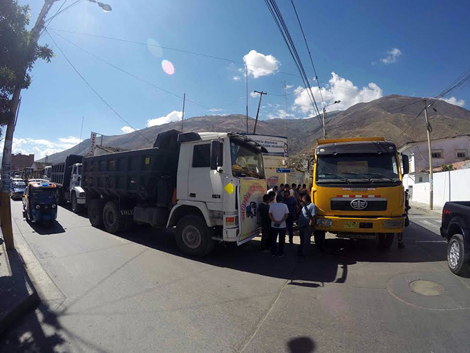 La Asociación de Volqueteros y Maquinarias que agrupa a 40 propietarios de 30 volquetes, retroexcavadoras, cargadores frontales y diversa maquinaria pesada, se movilizaron y cercaron el hospital con sus vehículos para exigir a la empresa que priorice a los huanuqueños.
