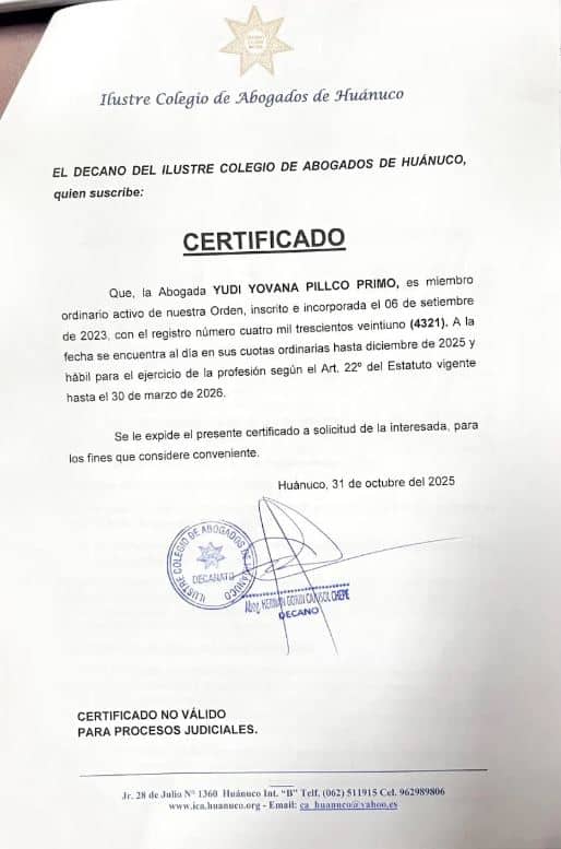 Una carta notarial enviada por Yudi Yovana Pillco Primo al Diario Ahora solicitó la rectificación inmediata de la información publicada el pasado mes de octubre, relacionada con una denuncia penal por presunta usurpación de funciones en la Red de Salud Huánuco. La remitente, identificada en documentos públicos como técnica en enfermería, afirma que fue designada legalmente como jefa de la Oficina de Asesoría Legal y que, por tanto, las imputaciones difundidas afectan su “imagen, honra y ejercicio profesional”.